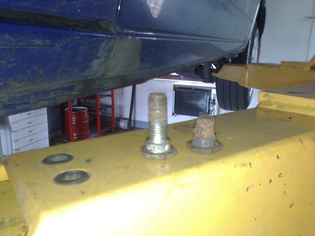 Taky jsem si stěžoval, že mi něco klepe na přední nápravě. Bylo to teď v neděli odpoledne, Tomáš to zkouknul, kvuli mě nejel k vodě a v tom odporném vedru mi otevřel dílnu. Hodili jsme to na hever a vyměnili zadní šroub držáku předního tlumiče vlevo.