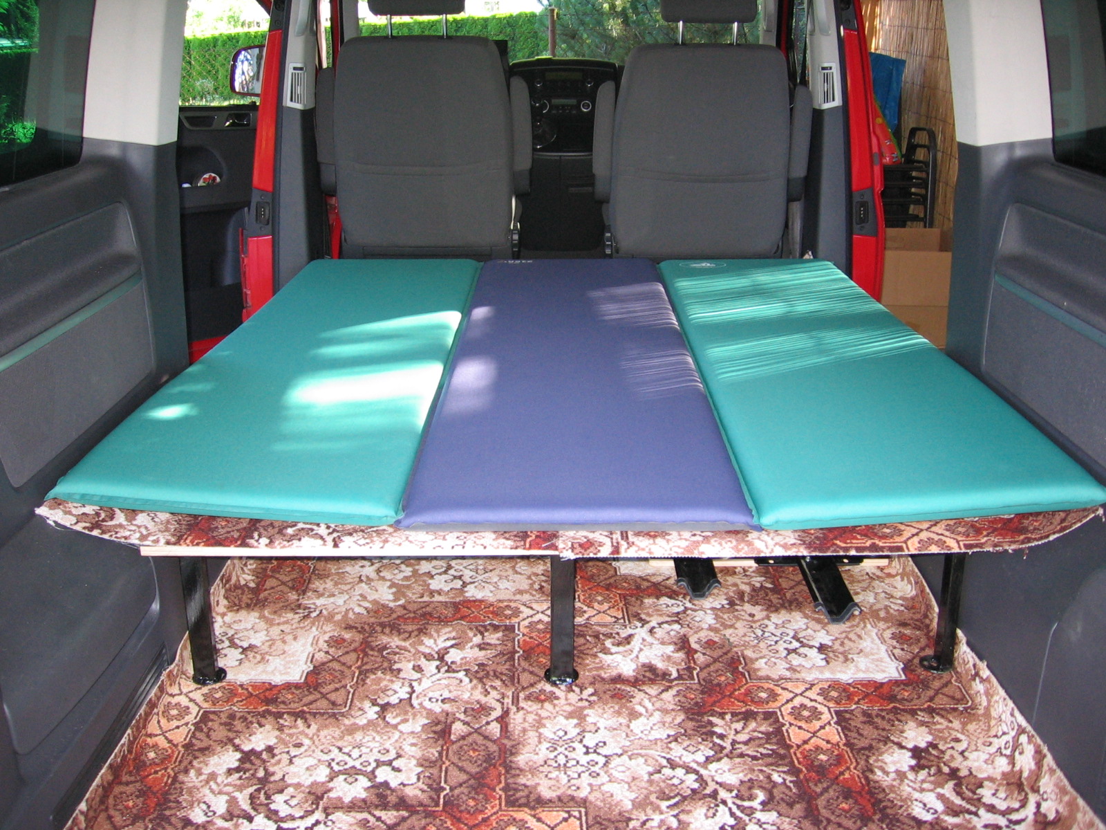 Začínali jsme v autě přespávat na dozadu sklopeném opěradle zadní lavice a vyrovnávací deskou mezi zadní a střední. Všelijaké vypodkládání však neskýtalo mnoho pohodlí.