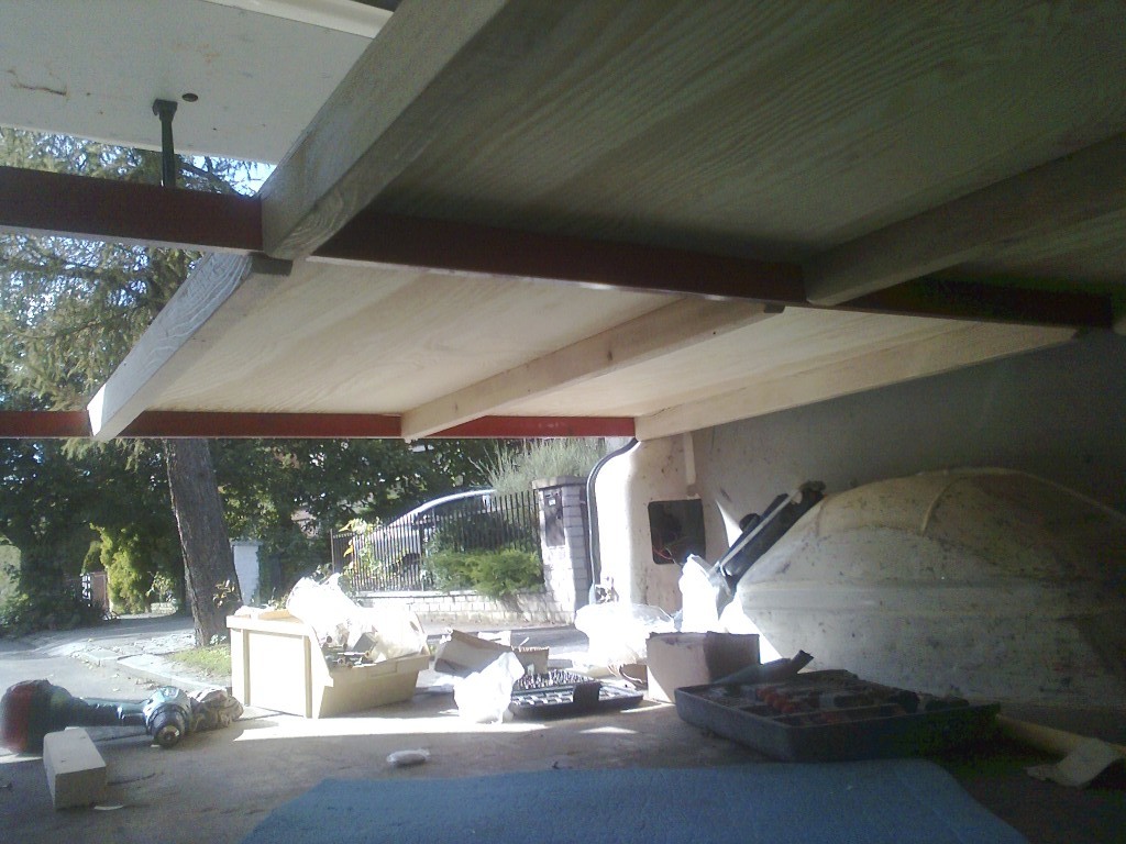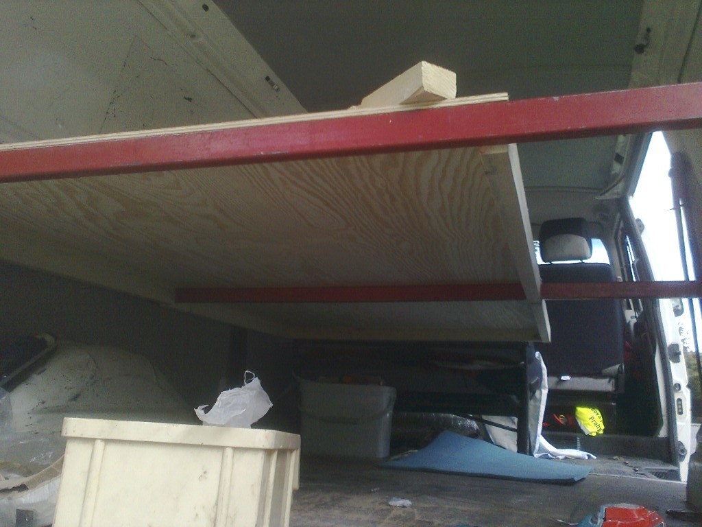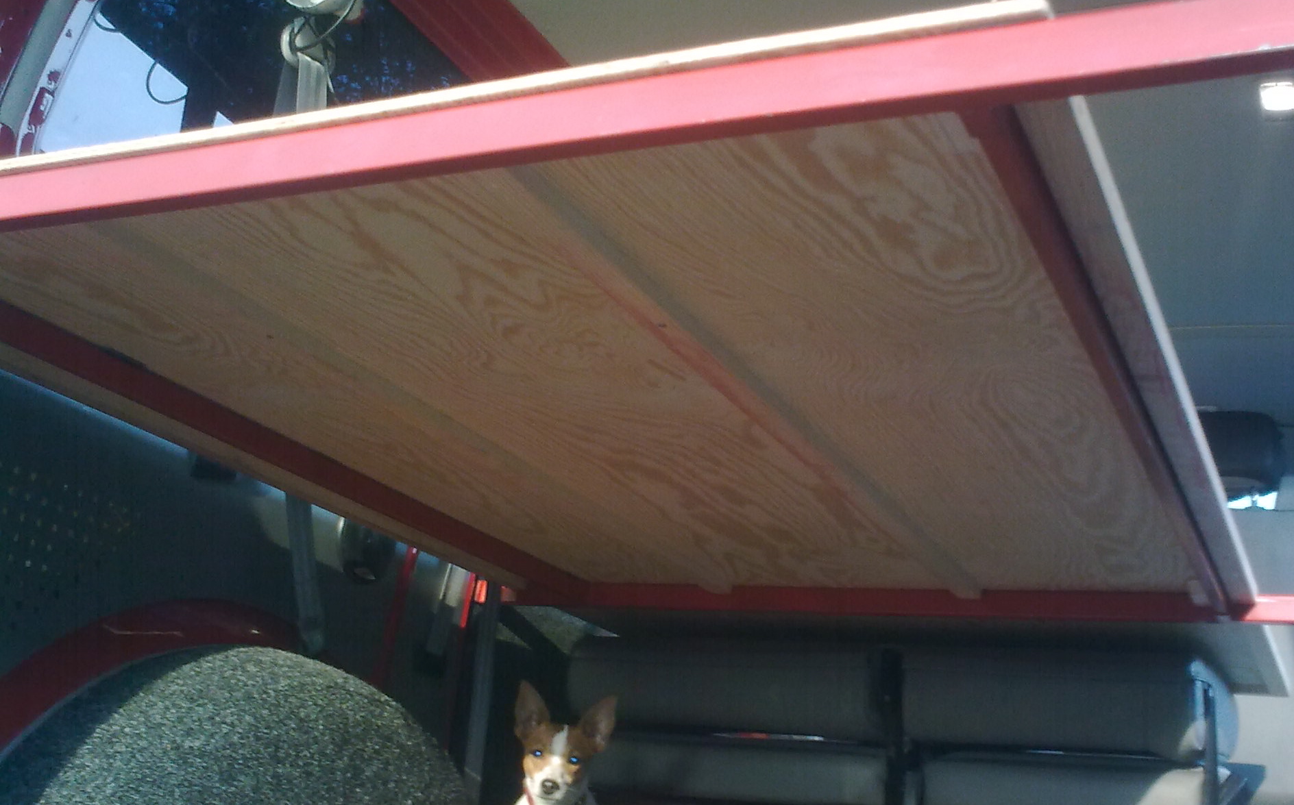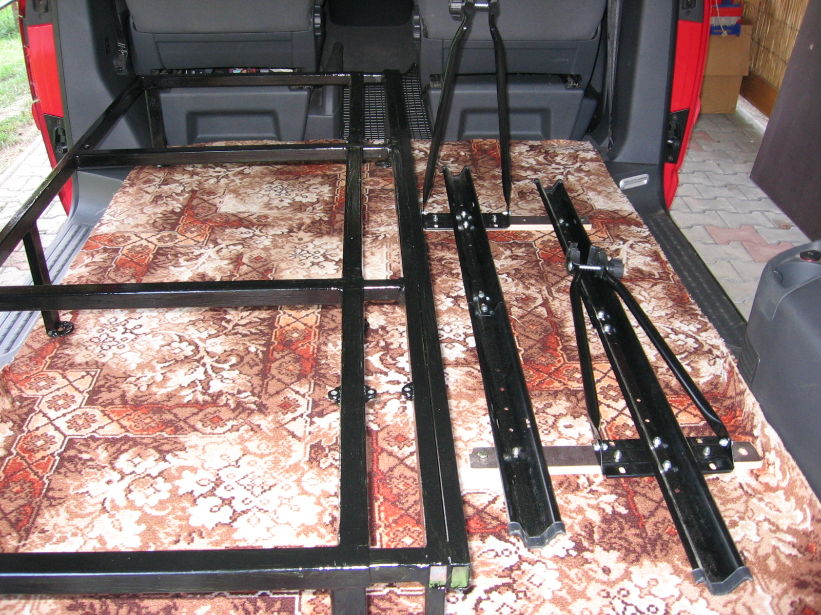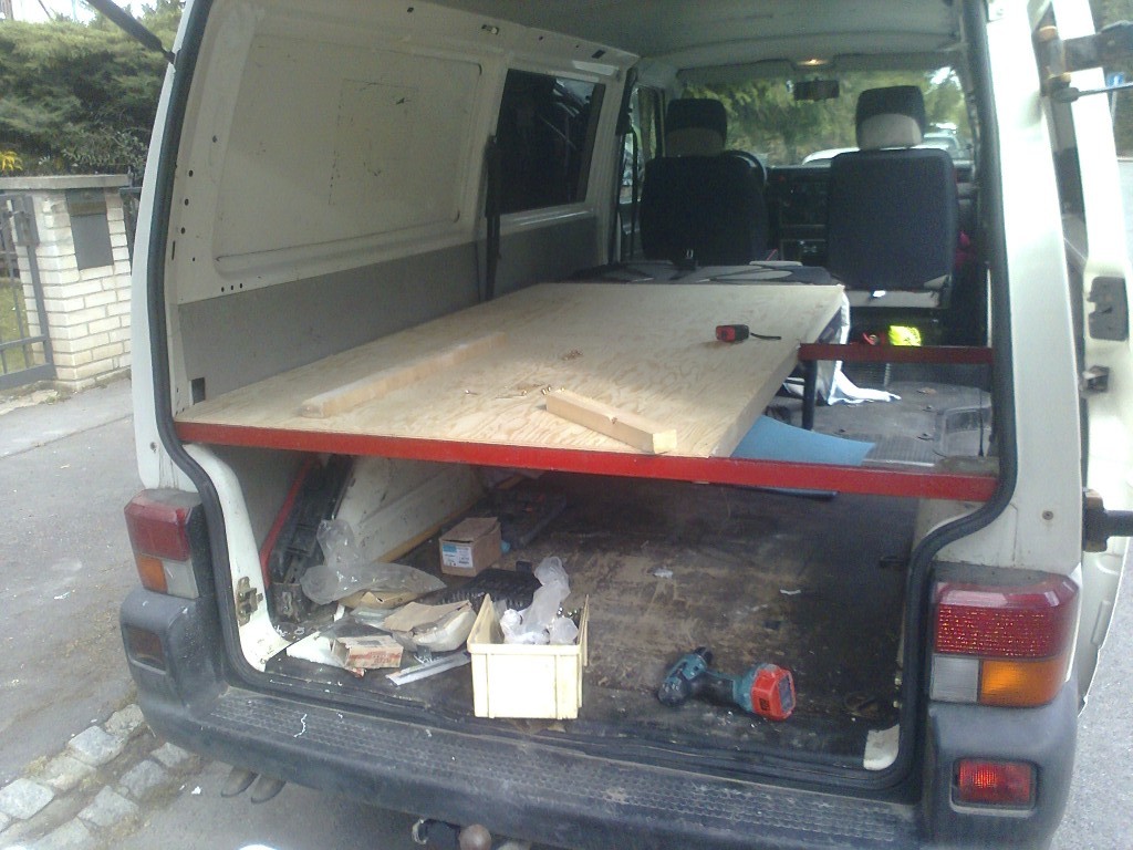 První pokusy o rovnou postel v T4 začaly deskou na dřevěných nožičkách. Ty začly časem vadit při manipulaci s ostatním nákladem (padák, loď...) a proto přišlo vylepšení, nosníky uchycené přímo v kastli. Jednotlivé díly jsou lehké a postel se dá složit za dvě minuty, přitom stále zůstává možnost použití všech 9ti míst (jsme wellká rodina :lol: ¨)