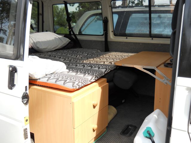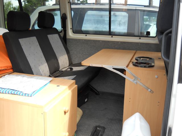 Díky tomu, je vše během 10minut demontováno a je z toho opět 9míst. bus. Prostřední řada sedaček je na přidané řadě špuntů posunuta dozadu, je to vlastně o šířku úchytů dozadu, aby se tam vešla "kuchyň"