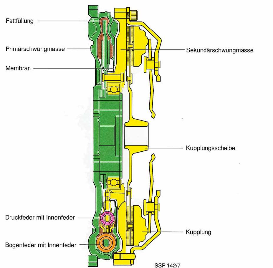 Primární část, zelená je svařená ze dvou dílů, ve které jsou pružinové pakety uloženy. Sekundární strana, žlutá je uložena na primáru kuličkovým ložiskem. Kroutící moment se z primáru na sekundár přenáší pružinovým svazkem. Spojka je našroubovaná na sekundáru. Elastické spojení primární a sekundární části je provedeno pomocí seriově spojeného vnějšího a vnitřního tlumiče, vlastní tlumení zajišťuje „Fettfüllung“ neboli náplň viskozního oleje, (hnědá barva), který svojí vysokou viskozitou funguje jako tlumení.