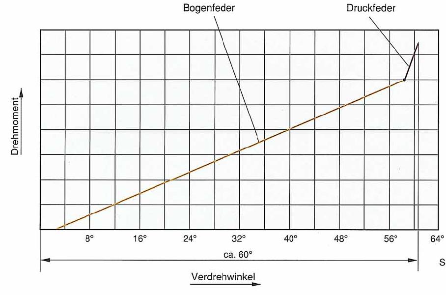 Z grafu obr.6 je jasně vidět rozsah působení vnějších pružin a nástup působení hvězdice tlačných pružin. Je vidět i úhel vzájemného protočení primáru a sekundáru až o cca 60° (Verdrehwinkel). Zajímavý je i počátek progrese , který začíná až při cca 3°, to znamená v praxi, že v klidu bez zátěže by v rozsahu oněch 3° mělo jít volně otáčet vnitřní částí proti vnější. To bych považoval i za hrubou kontrolu, jeli setrvák v pořádku nebo ne. Když strčím šroubovák do otvoru ve spojkové skříni, a mohu pohnout sekundárem volně o více než těch cca 3°, pak jsou pružiny nefunkční, a setrvačník je vadný.
