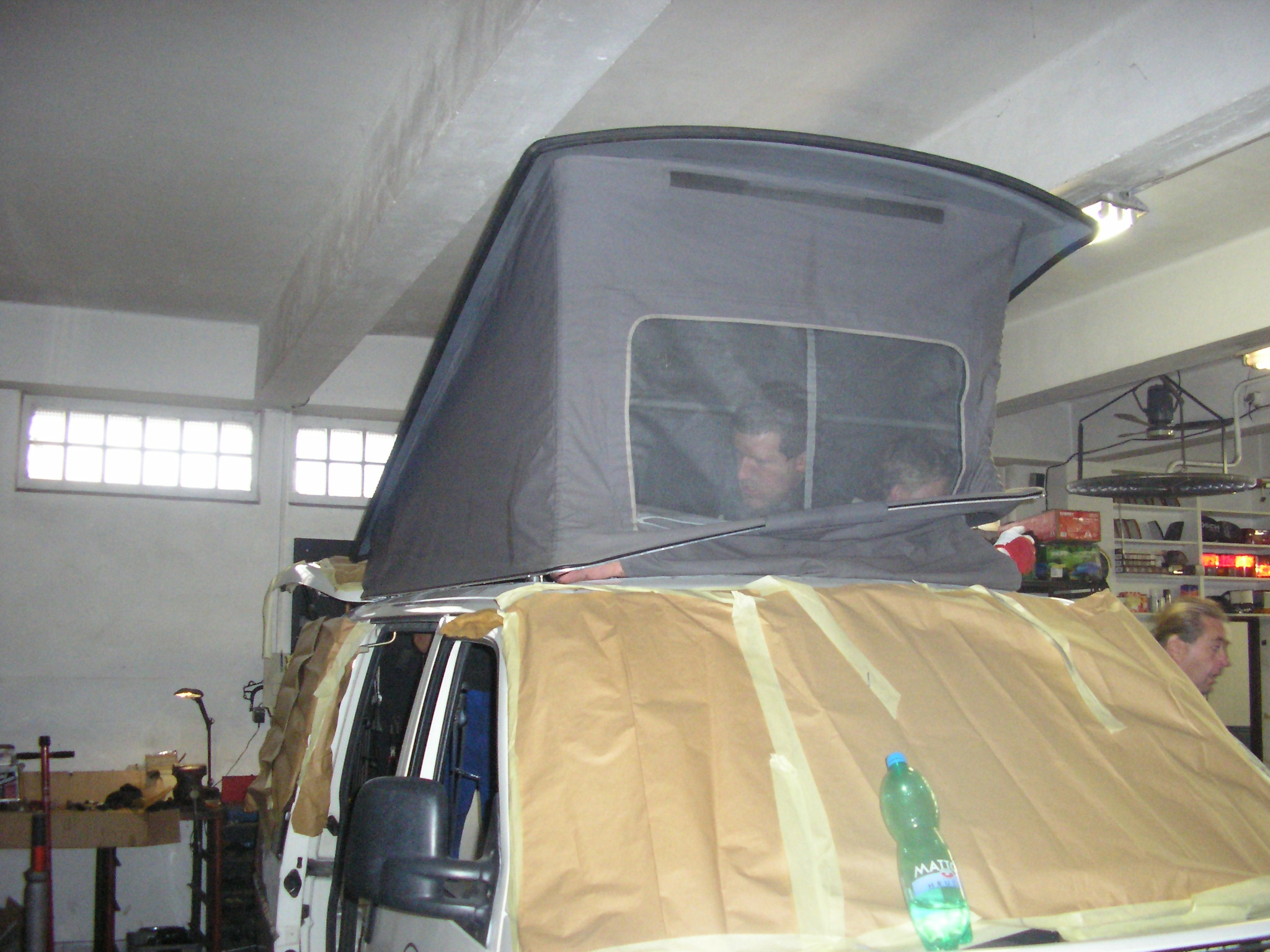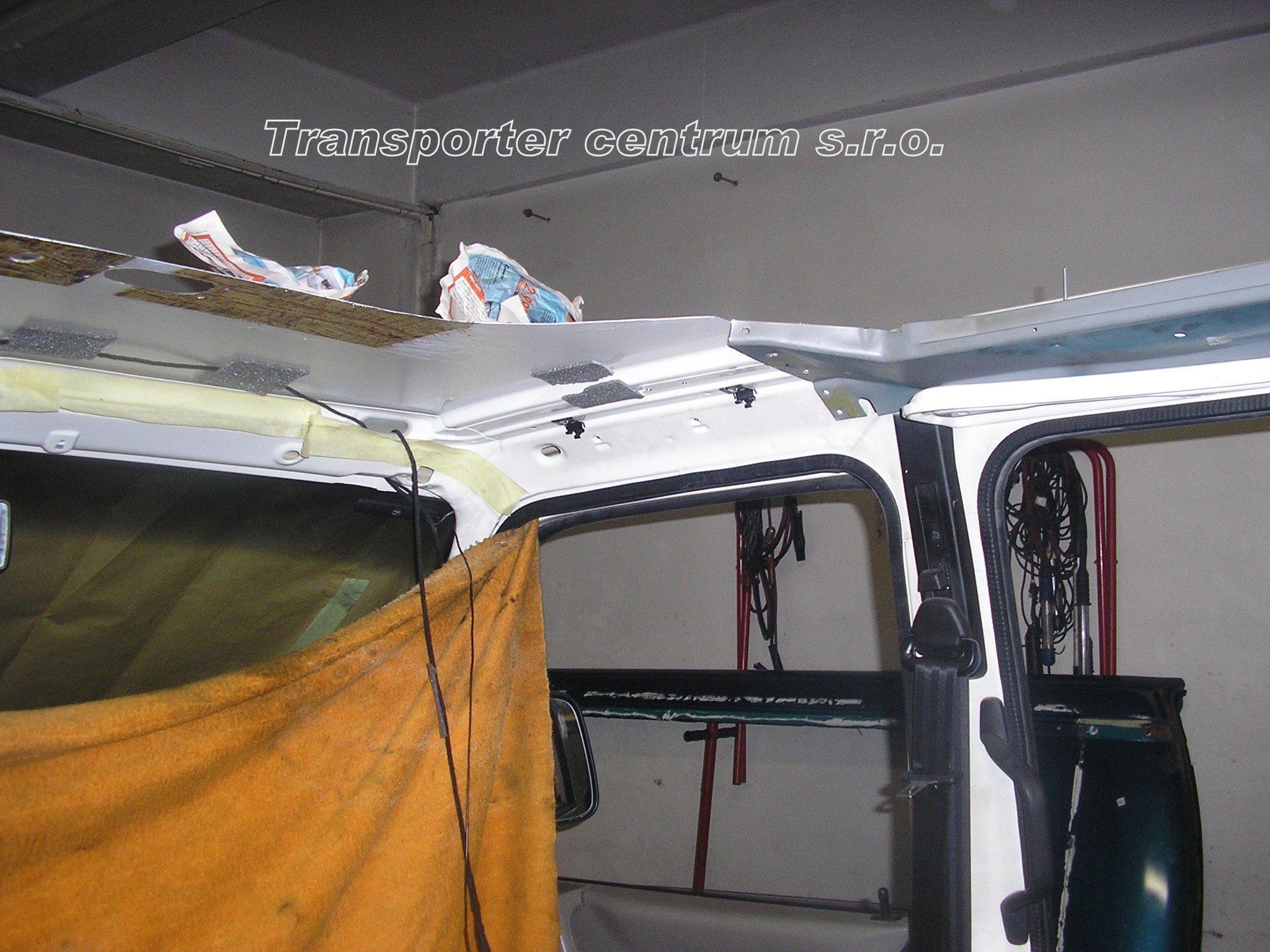 Před pár lety jsme montovali zvedačku na T4 se dvěma posuvnými dveřmi,zákazník si dovezl zvedačku uřízlou ve sloupkách,nejdříve jsme zvedačku demontovali z torza plechové střechy,a na autě jme to vyměřili a vyřízli,výstuhy zvedačky se nalepily karosářským tmelem,části odříznuté karosérie(tam kde byl holý plech)jsme nastříkali abychom zamezili případné korozi.Po kompletní montáži a lakovně jsme části střechy vystříkali voskem na dutiny.Ještě se musela upravit výstuha a rám zvedačky na levé straně,poněvač auto má dvoje posuvné dveře a zvedačka byla z modelu kde byly jedny posuvné dveře.