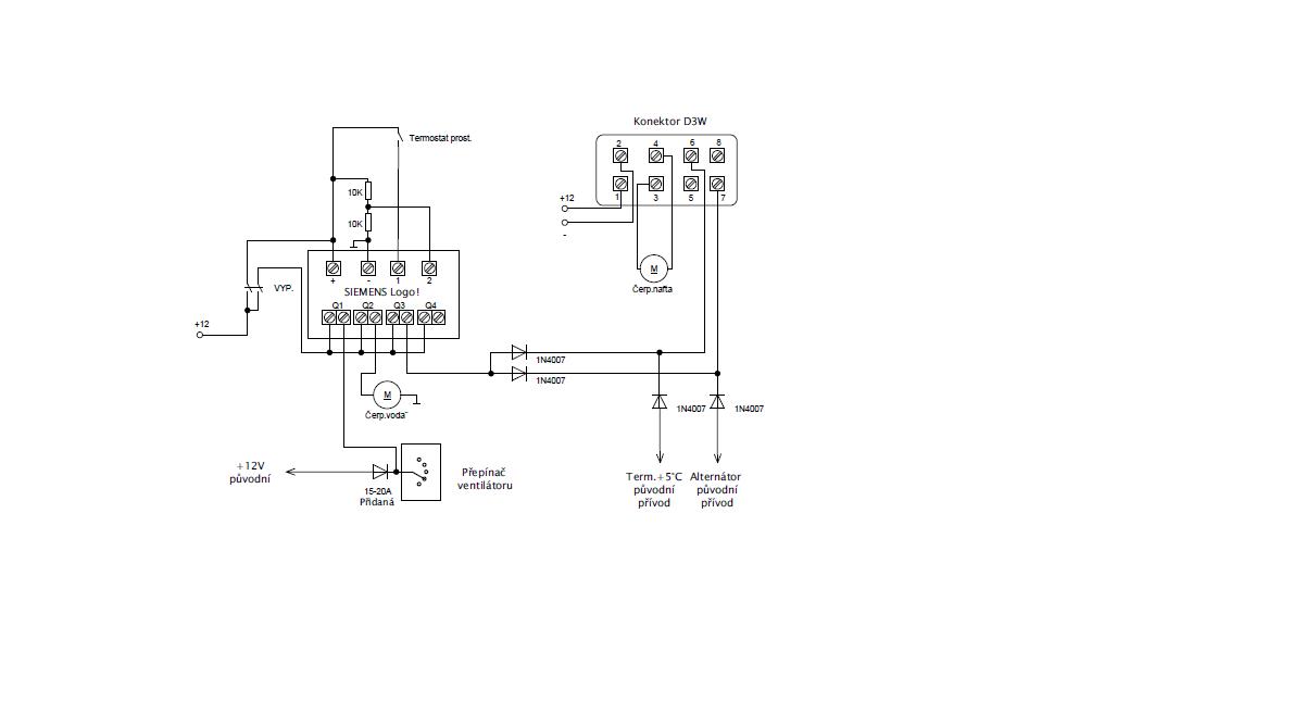 Ostatní diody v zapojení jsou nutné z důvodu, aby se to celé "nehádalo" s původní palubní instalací.