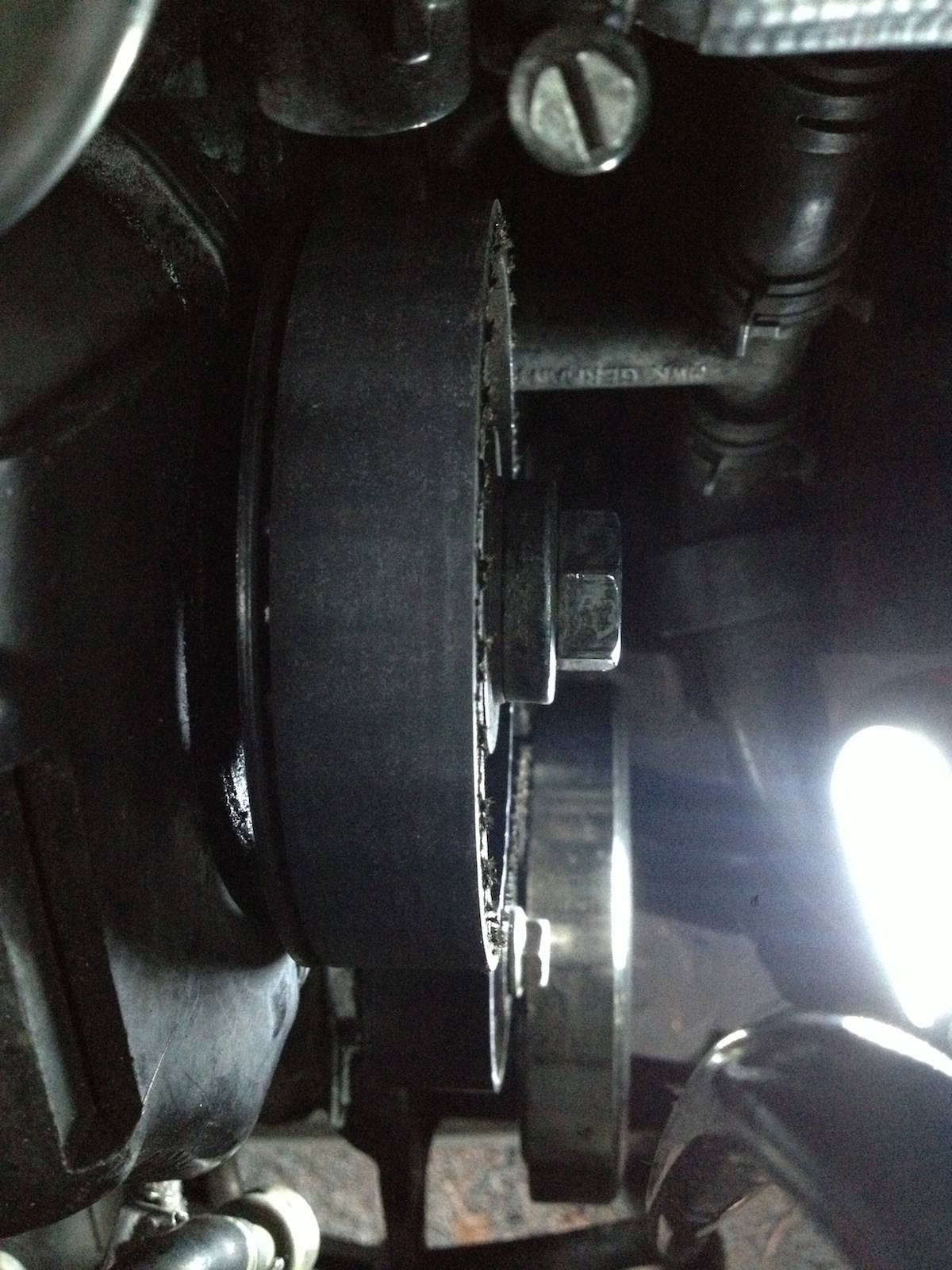 stalo se nekomu ze se vybehala drazka do remenu na cerpadle ?remen mam o par mm posunuty z napinaci kladky smerem na hranu remenice cerpadla... myslel sem ze to bude spatnej remen nebo napinaci vymenil sem vse ale stalo se po par tisicich to same...diky za rady preposilam i foto
